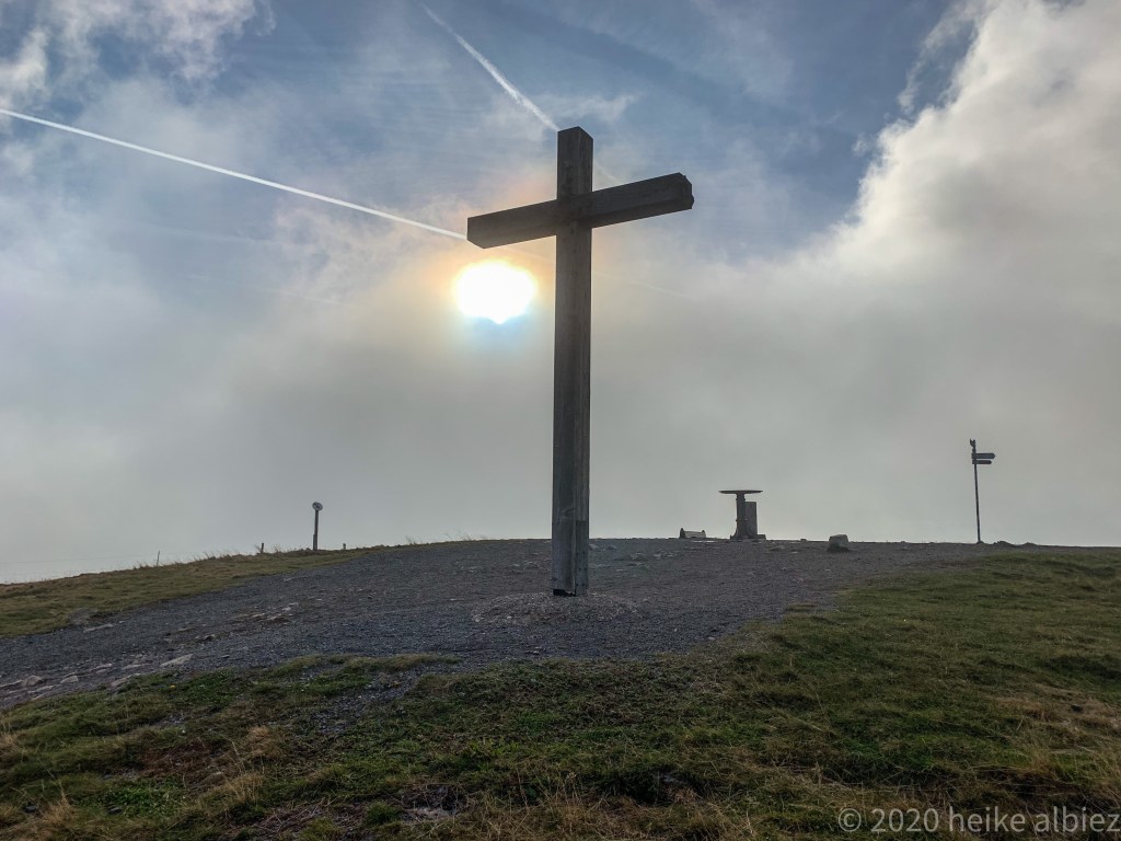 Hier verweilte ich ne gute halbe Stunde. Kaffee, belegte Brötchen, Schokoriegel alles dabei. Kaum hatte ich es mir gemütlich gemacht, bemerkte ich, dass sich hier wohl auch die Frühsportler hingezogen fühlten. Es wurde gejoggt, gewalkt und Gassi gegangen. Woher kamen denn die ganzen bewegungsfreudigen Leute? Gresgen, höchstwahrscheinlich, denn dieses kleine bezaubernde Bergdörfchen liegt ja unmittelbar hier oben in der Nähe, genau gesagt, auf dem Wegweisers stand, 1,4 km.