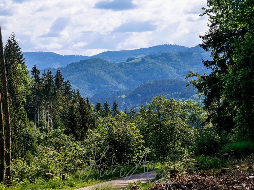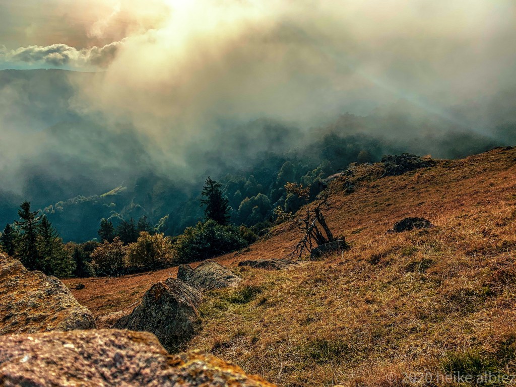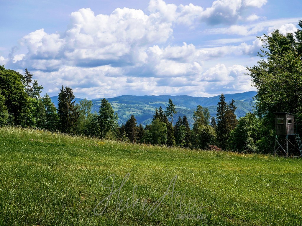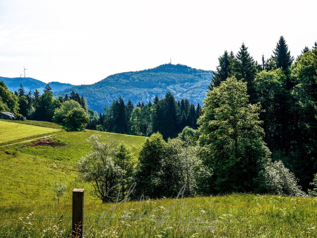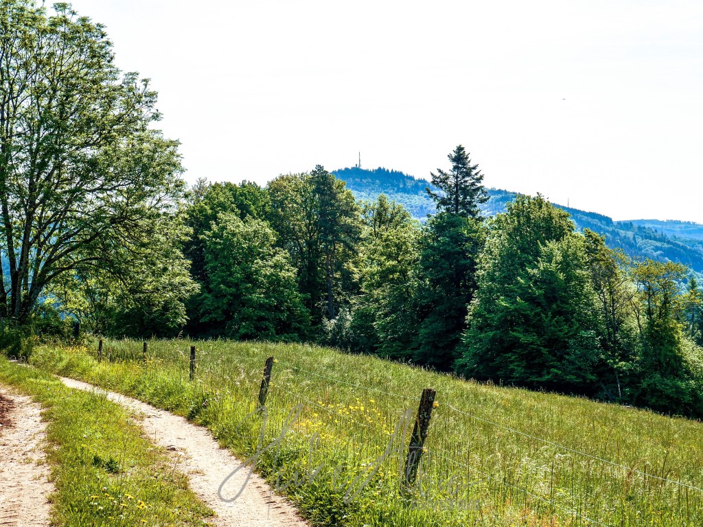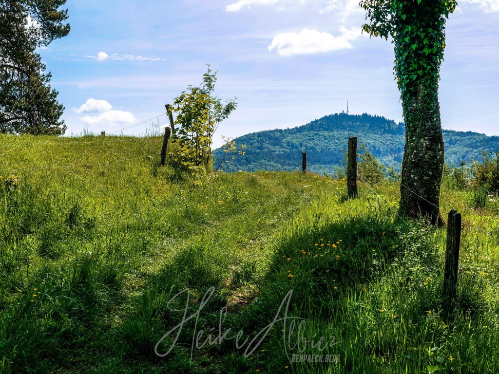 Gestärkt ging’s weiter der nun gelben Route folgend, zum heutigen Ziel, Rümmelesbühl! Ein wunderschöner Ausblick eröffnete sich mir und die Chance einen für mich bis dahin unscheinbaren Berg, mit ganz anderen Augen zu sehen. Es handelt sich hierbei um die Hohe Möhr ( 988,8 m NHN ) sie liegt hier im Landkreis Lörrach in der Nähe von Schopfheim, ein Steinwurf von unserem zu Hause entfernt und doch war ich noch nie zu ihr hinauf gewandert. War für mich ein einfacher Familien Berg für Wochenendausflüge, aber wie gesagt, meine Einstellung dazu hat sich geändert. Ich werde eine Tour auf die Hohe Möhr einplanen und ihr mir mittlerweile interessantes Relief erkunden. Nun aber weiter, schließlich möchte ich ja euch nicht den schönsten Anblick, diesen Tages, zu lange vorenthalten.
