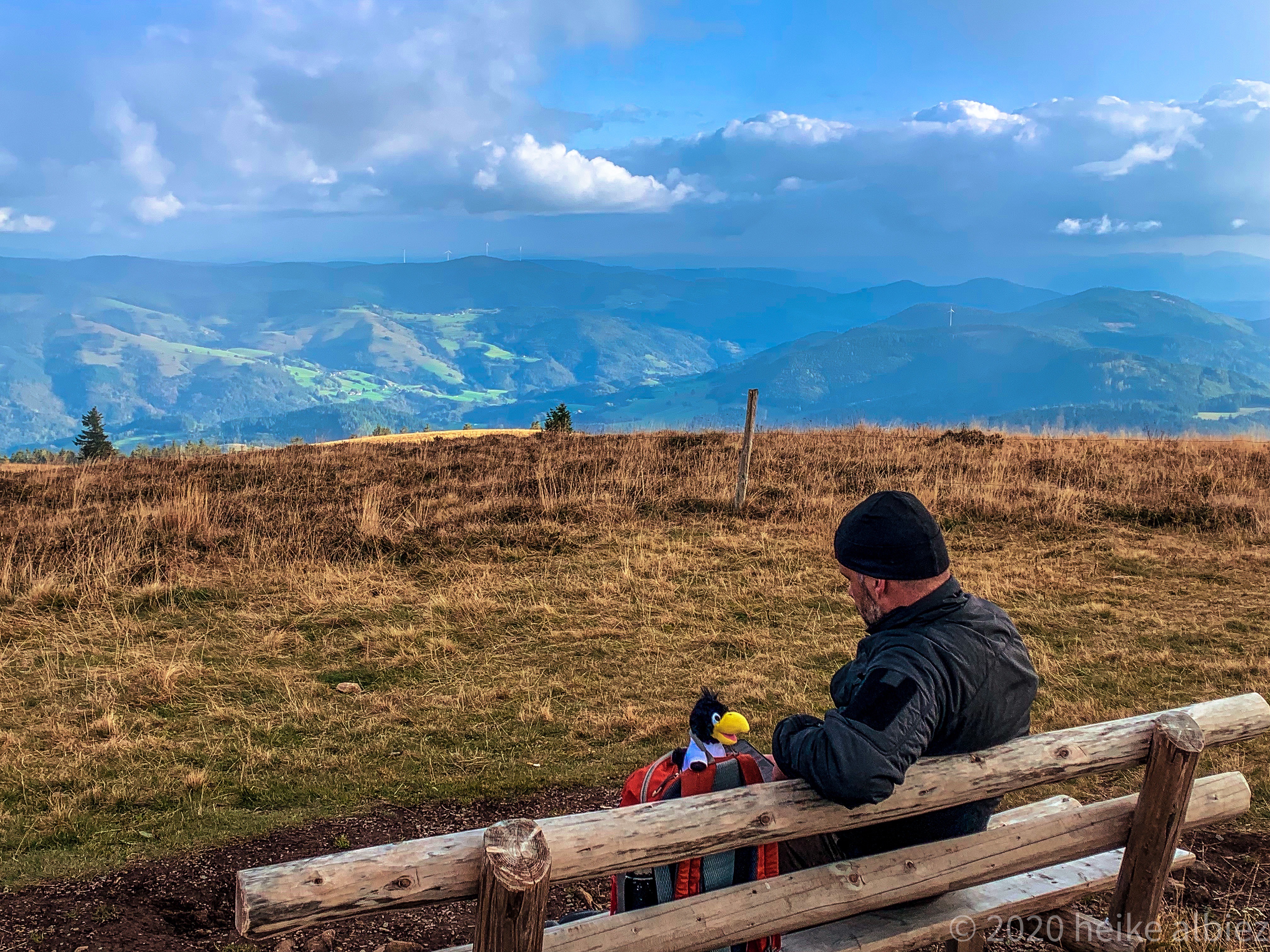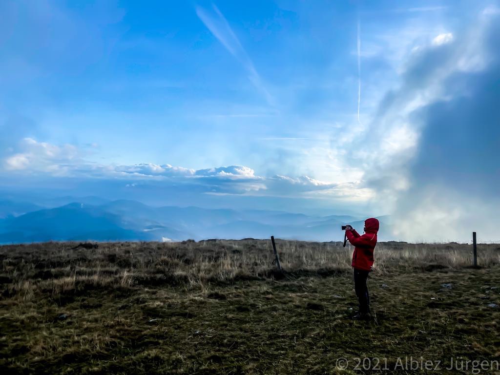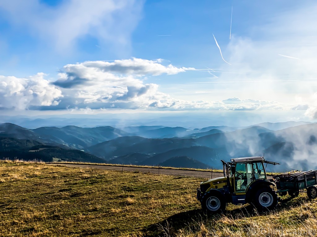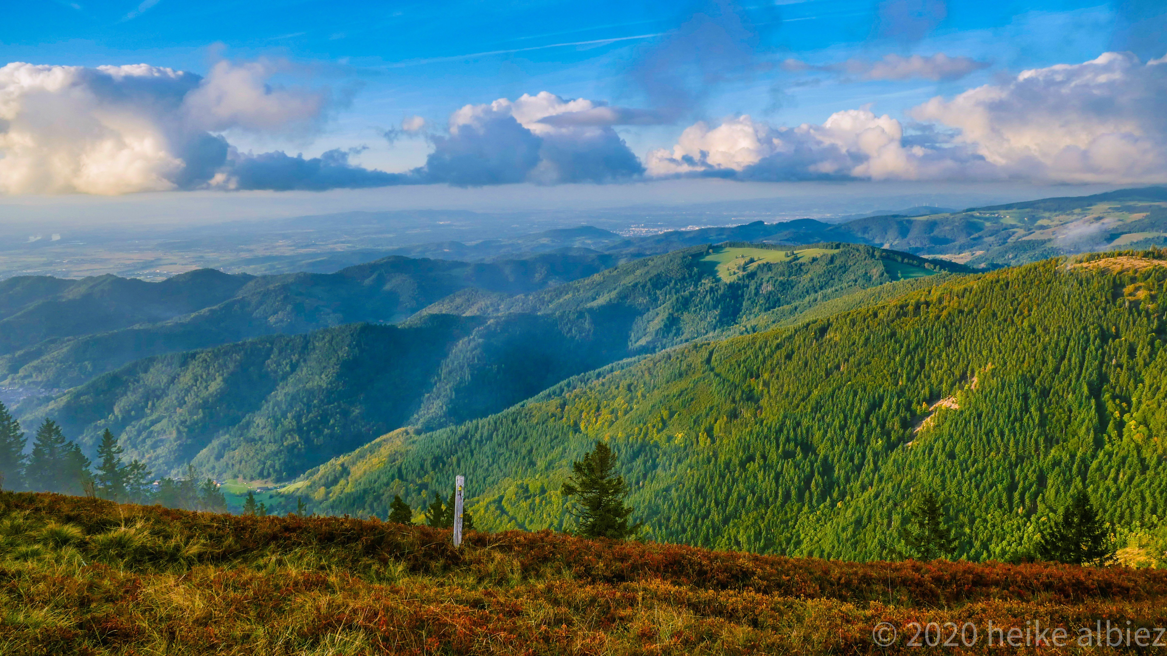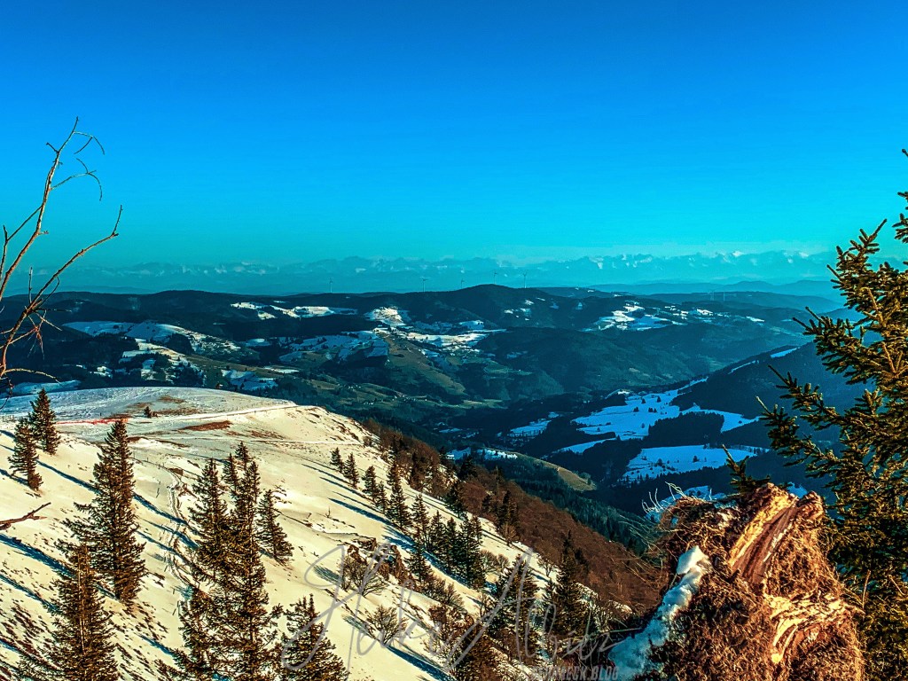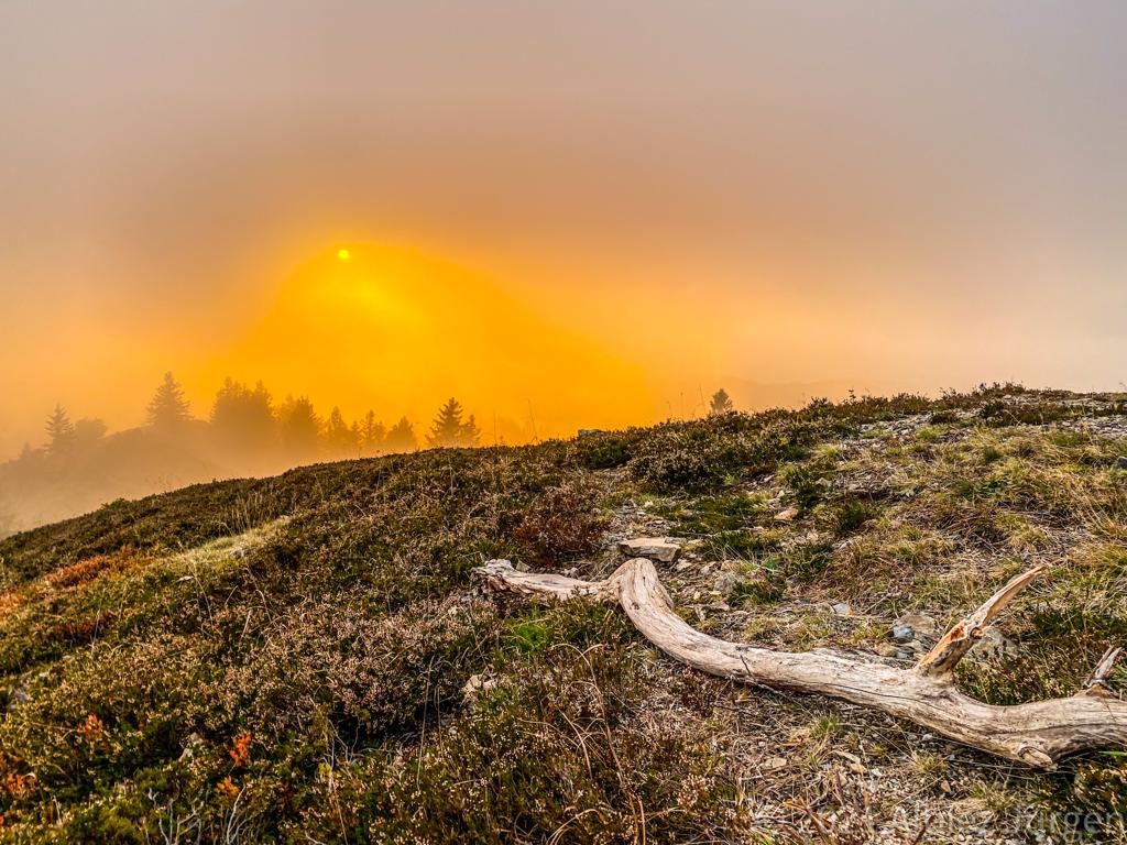 Gestärkt ging’s weiter der nun gelben Route folgend, zum heutigen Ziel, Rümmelesbühl! Ein wunderschöner Ausblick eröffnete sich mir und die Chance einen für mich bis dahin unscheinbaren Berg, mit ganz anderen Augen zu sehen. Es handelt sich hierbei um die Hohe Möhr ( 988,8 m NHN ) sie liegt hier im Landkreis Lörrach in der Nähe von Schopfheim, ein Steinwurf von unserem zu Hause entfernt und doch war ich noch nie zu ihr hinauf gewandert. War für mich ein einfacher Familien Berg für Wochenendausflüge, aber wie gesagt, meine Einstellung dazu hat sich geändert. Ich werde eine Tour auf die Hohe Möhr einplanen und ihr mir mittlerweile interessantes Relief erkunden. Nun aber weiter, schließlich möchte ich ja euch nicht den schönsten Anblick, diesen Tages, zu lange vorenthalten.