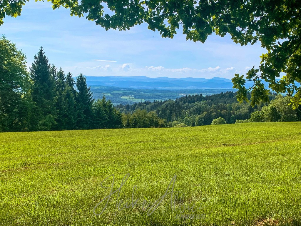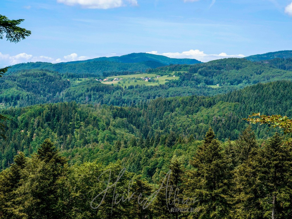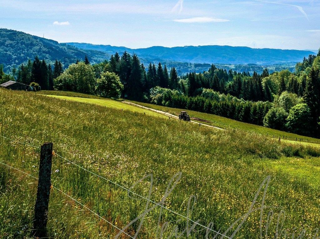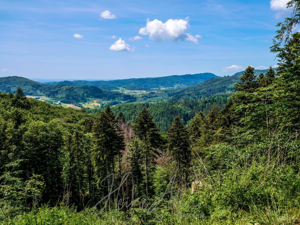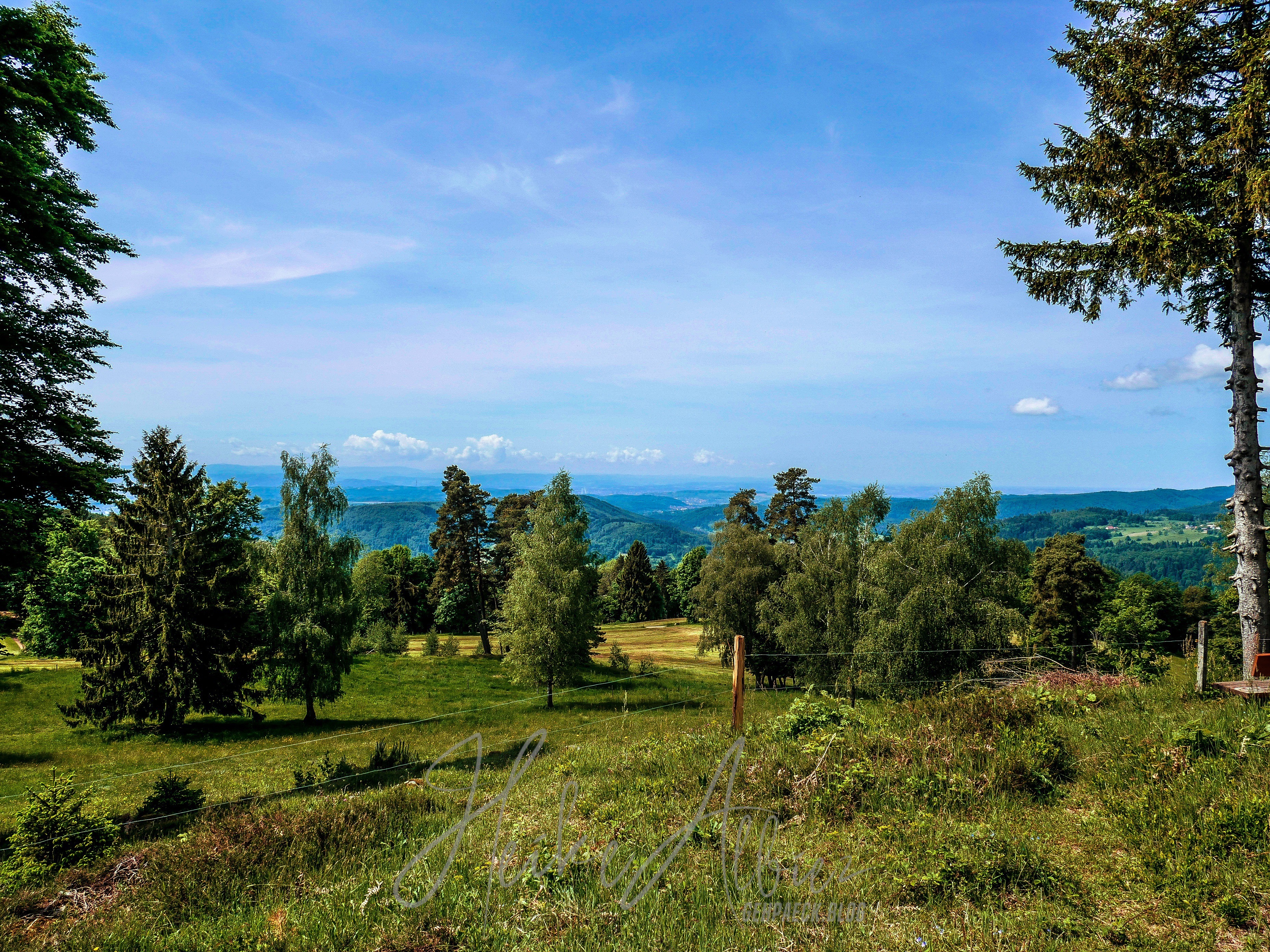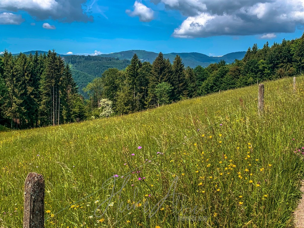 War dies noch zu übertrumpfen? Ich ging also weiter und was soll ich sagen, so etwas liebliches, idyllisch wunderschönes hatte ich hier oben nicht erwartet. Als erstes eröffnete sich mir eine kunterbunte Blumenwiese, kniehoch kitzelten mich die Gräser, als ich auf dem schmalen Pfad hinauf wanderte. Oben angekommen, fand ich eine Bank, ideal, um eine Pause einzulegen. Ich war sofort von diesem Ort gefangen genommen, ich kann das nicht mit Worten beschreiben, wie wohl mir dort war. Diese Aussicht , diese Wiese mit ihren Wilden so verschieden durcheinander gewachsenen Blumen und Gräsern. Die Bäume durch die sanft der Wind die Blätter umsäuselt und leise ein zartes Rascheln erweckt. Diese Harmonie die mich umgab und so tief durchatmen ließ. Ich hätte ewig dort oben sitzen können, zwischen dieser wahrscheinlich uralten Eiche und der nebenan so kräftig, stark hochgewachsenen gleichaltriger Tanne. Zwei so, für mich, majestätisch anzuschauende Bäume, wo gleichzeitig so eine Ruhe und Friedlichkeit ausstrahlen. So verweilte ich dort ein paar mehr Minuten und bewunderte diese Bilderbuchlandschaft, aus der Nähe, sowie in der Weite. Von hier konnte ich schon bis in die Vogesen schauen.