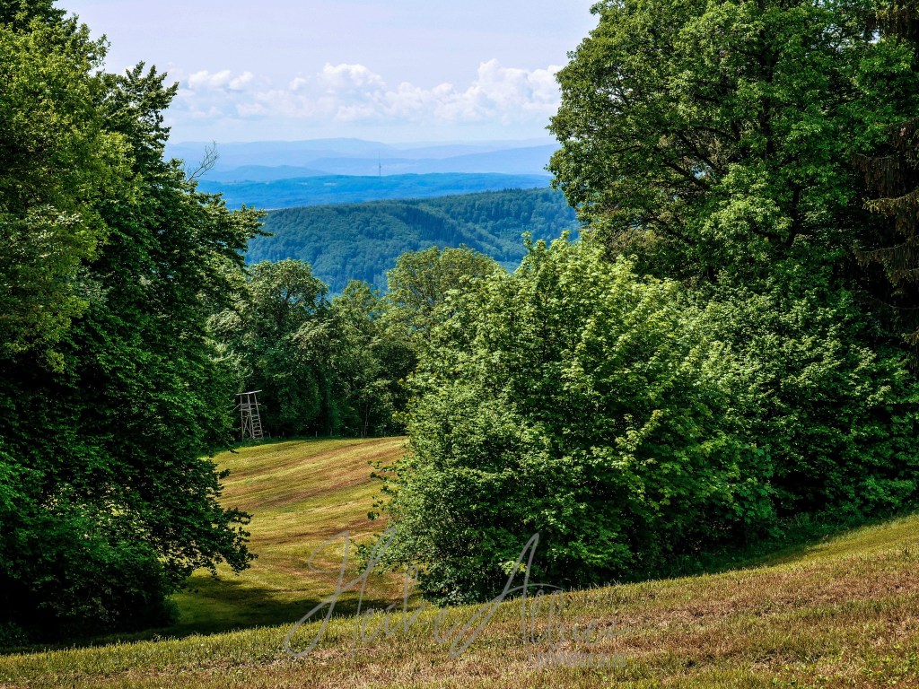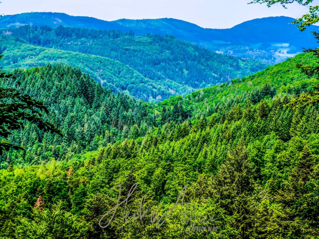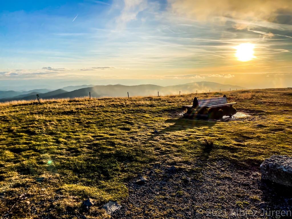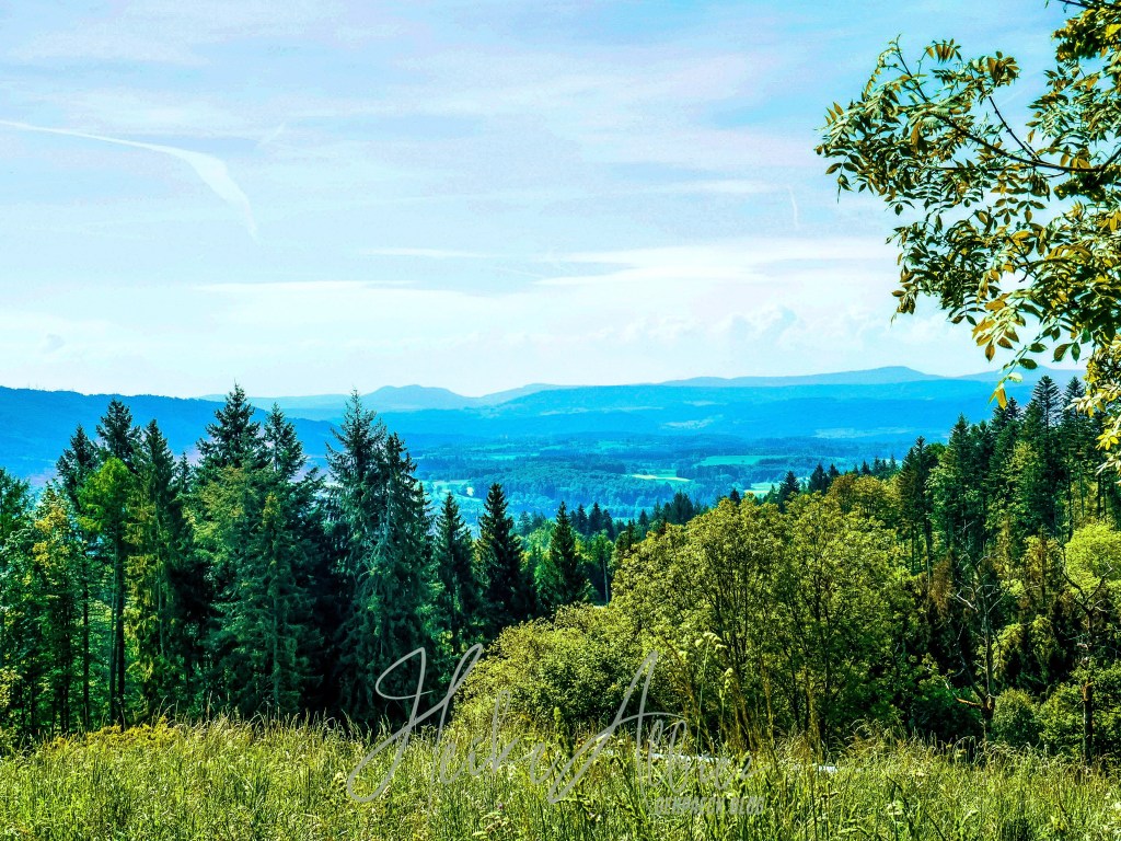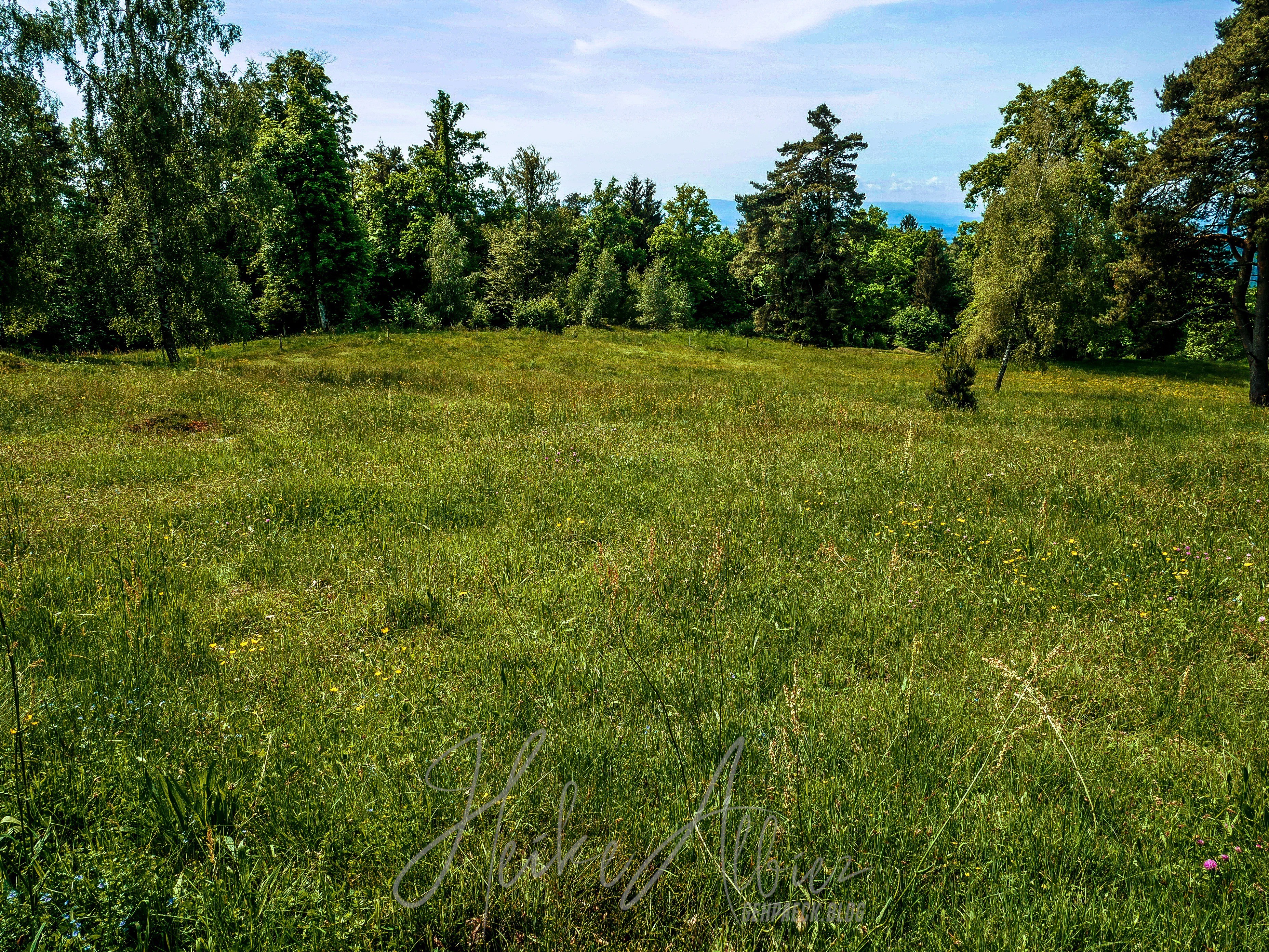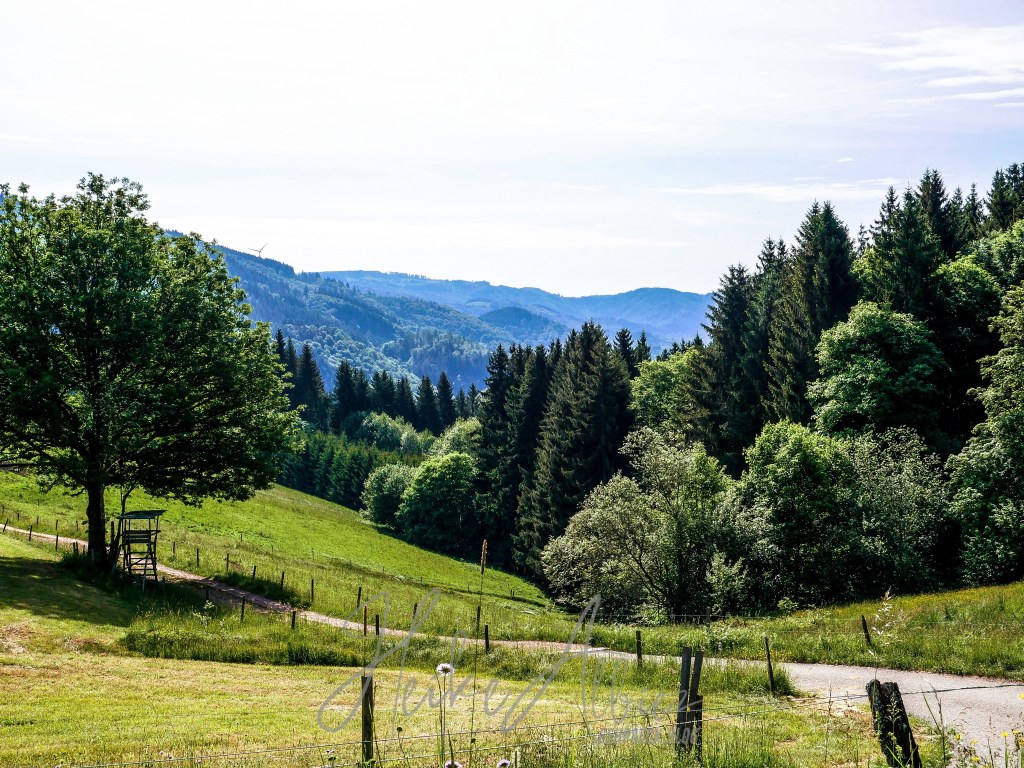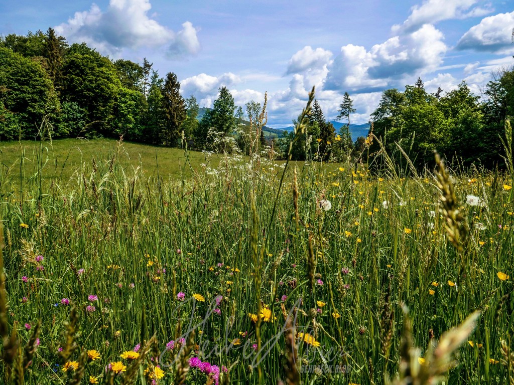War dies noch zu übertrumpfen? Ich ging also weiter und was soll ich sagen, so etwas liebliches, idyllisch wunderschönes hatte ich hier oben nicht erwartet. Als erstes eröffnete sich mir eine kunterbunte Blumenwiese, kniehoch kitzelten mich die Gräser, als ich auf dem schmalen Pfad hinauf wanderte. Oben angekommen, fand ich eine Bank, ideal, um eine Pause einzulegen. Ich war sofort von diesem Ort gefangen genommen, ich kann das nicht mit Worten beschreiben, wie wohl mir dort war. Diese Aussicht , diese Wiese mit ihren Wilden so verschieden durcheinander gewachsenen Blumen und Gräsern. Die Bäume durch die sanft der Wind die Blätter umsäuselt und leise ein zartes Rascheln erweckt. Diese Harmonie die mich umgab und so tief durchatmen ließ. Ich hätte ewig dort oben sitzen können, zwischen dieser wahrscheinlich uralten Eiche und der nebenan so kräftig, stark hochgewachsenen gleichaltriger Tanne. Zwei so, für mich, majestätisch anzuschauende Bäume, wo gleichzeitig so eine Ruhe und Friedlichkeit ausstrahlen. So verweilte ich dort ein paar mehr Minuten und bewunderte diese Bilderbuchlandschaft, aus der Nähe, sowie in der Weite. Von hier konnte ich schon bis in die Vogesen schauen.