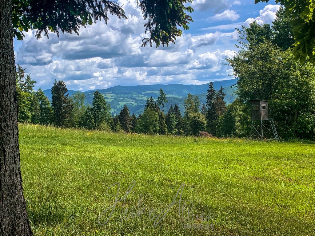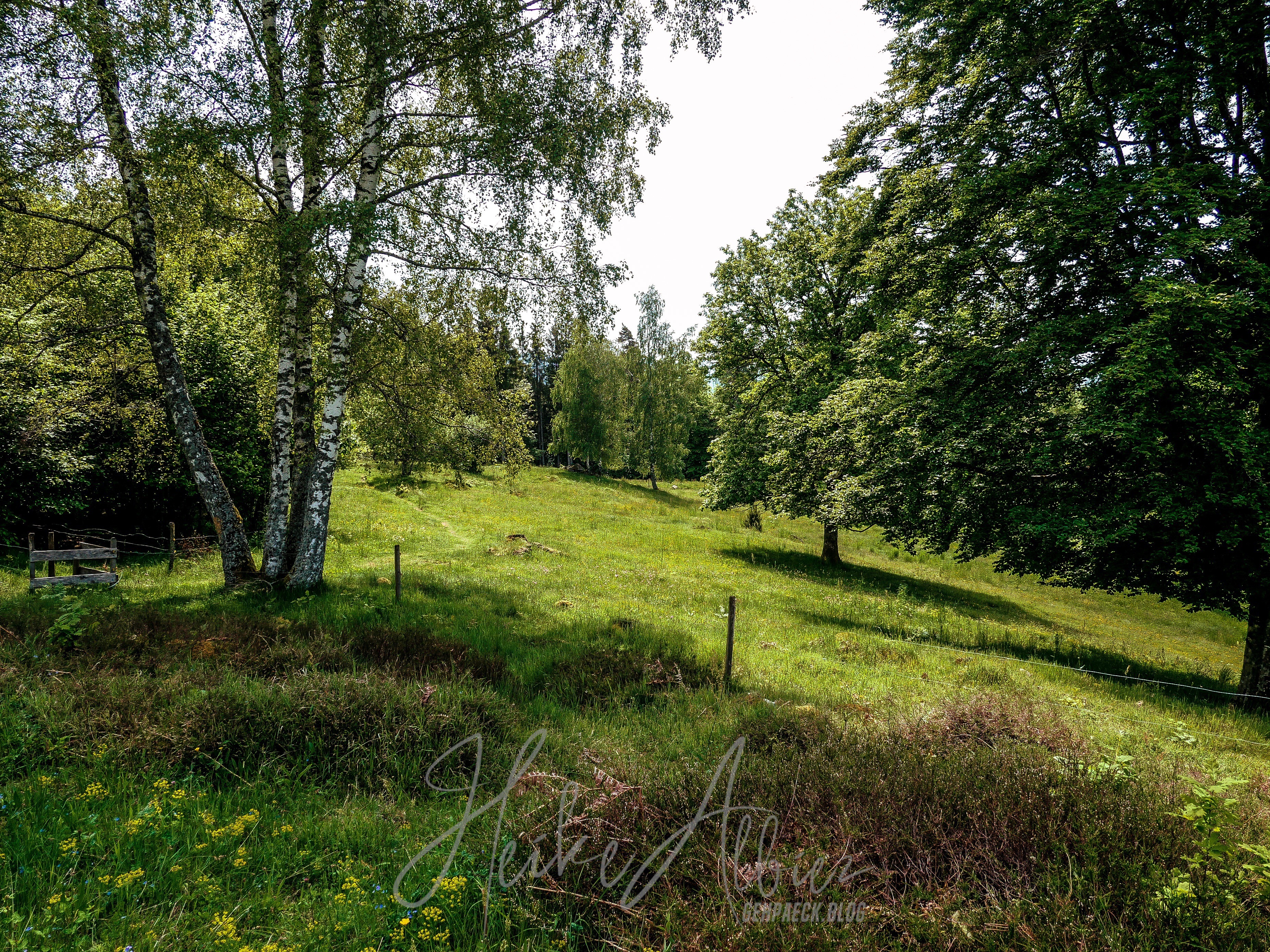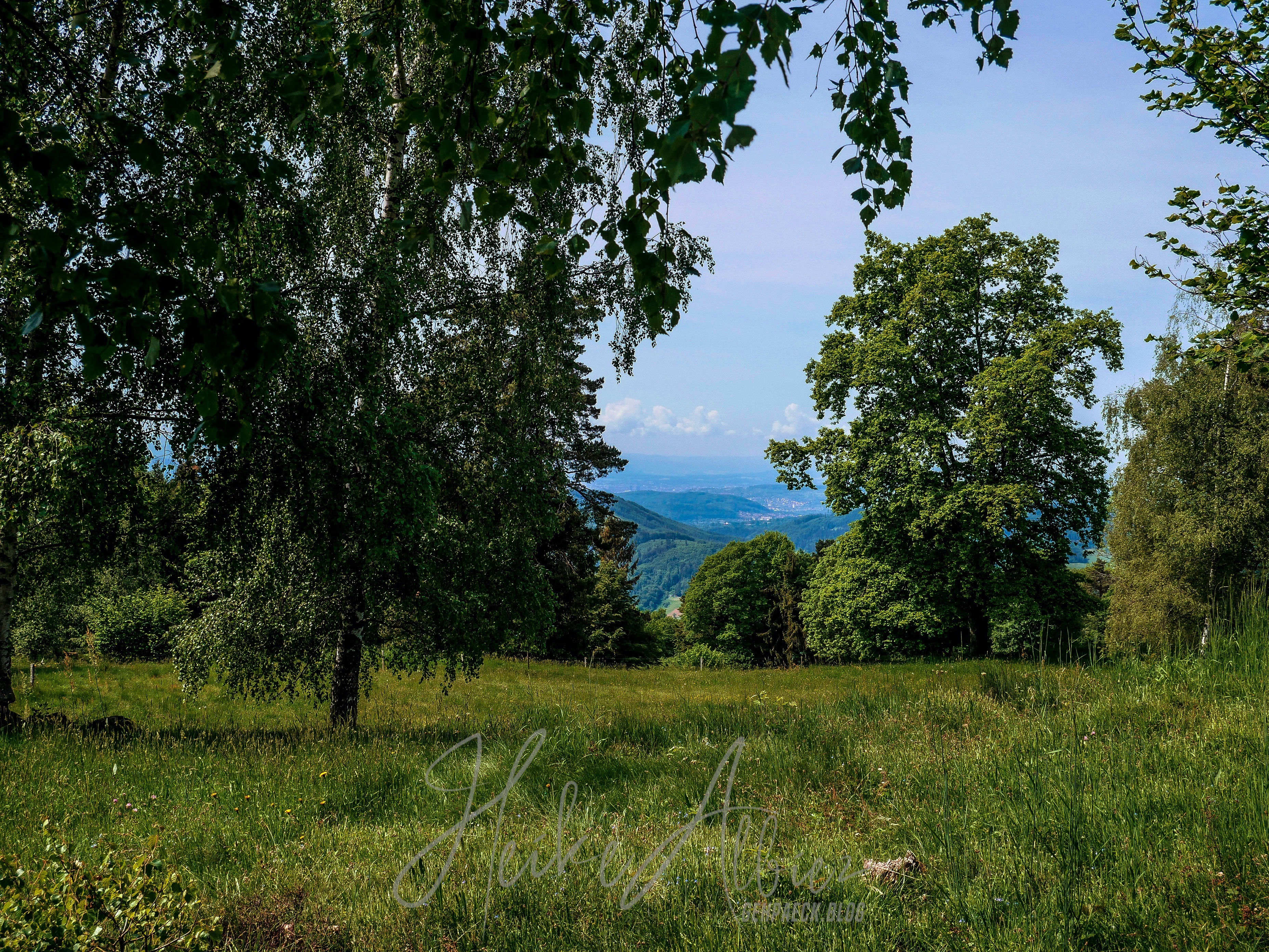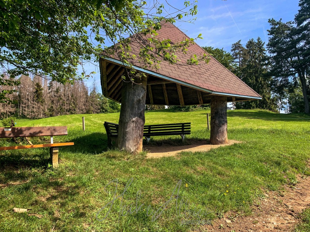 Dieses wunderschöne Fleckchen Erde nennt sich „Rossboden“ , von hier aus wahr es nicht mehr weit zum laufen, der Rümmelesbühl Turm war mit 200 m ausgeschrieben. So hieß es für mich Abschied nehmen von dem so schönen Plätzchen, an dem ich hätte noch ewig so ruhend sitzen und die Seele baumeln lassen können. Noch unwissend, welches kleines Highlight mich noch erwartete, lief ich in die ausgeschilderte Richtung. Wieder war das Gras kniehoch gewachsen, ein Drahtzaun trennte die Viehweide vom Weg, es ging nochmals eine kleine Anhöhe hinauf , auf deren Kuppel ein Türmchen zu erkennen war. Abermals erblickte ich staunend ein sich in Harmonie wiegendes Landschaftsbild. Wo bin ich hier? Also ja, bei uns ist es schön in Deutschland, wir haben alles, Berge, Seen, Wälder, Flüsse und ein Wiesental, welches sich hier oben, von einer seiner schönsten Seite zeigt. Hier wachsen Birken in mitten grüner mit Gräsern überwachsener Wiesen, sie wiegen sich im Winde und ihre Blätter tanzen, so wirkt es jedenfalls auf mich. Hier und dort mal ein Felsbrocken ragt hervor, dann diese Aussicht und oben der liebevoll angelegte Grillplatz, rings um diesen kleinen Turm, mit Sonnenliegen und genügend weiteren Sitzmöglichkeiten die einen unweigerlich zum verweilen einladen. Dank des Gresgener Verschönerungsverein, kann man hier herrlich rasten und genießen. Es gibt sogar ein „Hüttenbuch“ in welches man etwas hinein schreiben kann. Ich verweile und schaue mir alles ringsum in Ruhe an, mach meine Bilder und freu mich, dass mich mein Weg hier her geführt hat. Leider wird es Zeit den Rückweg anzutreten und ich zottele los.