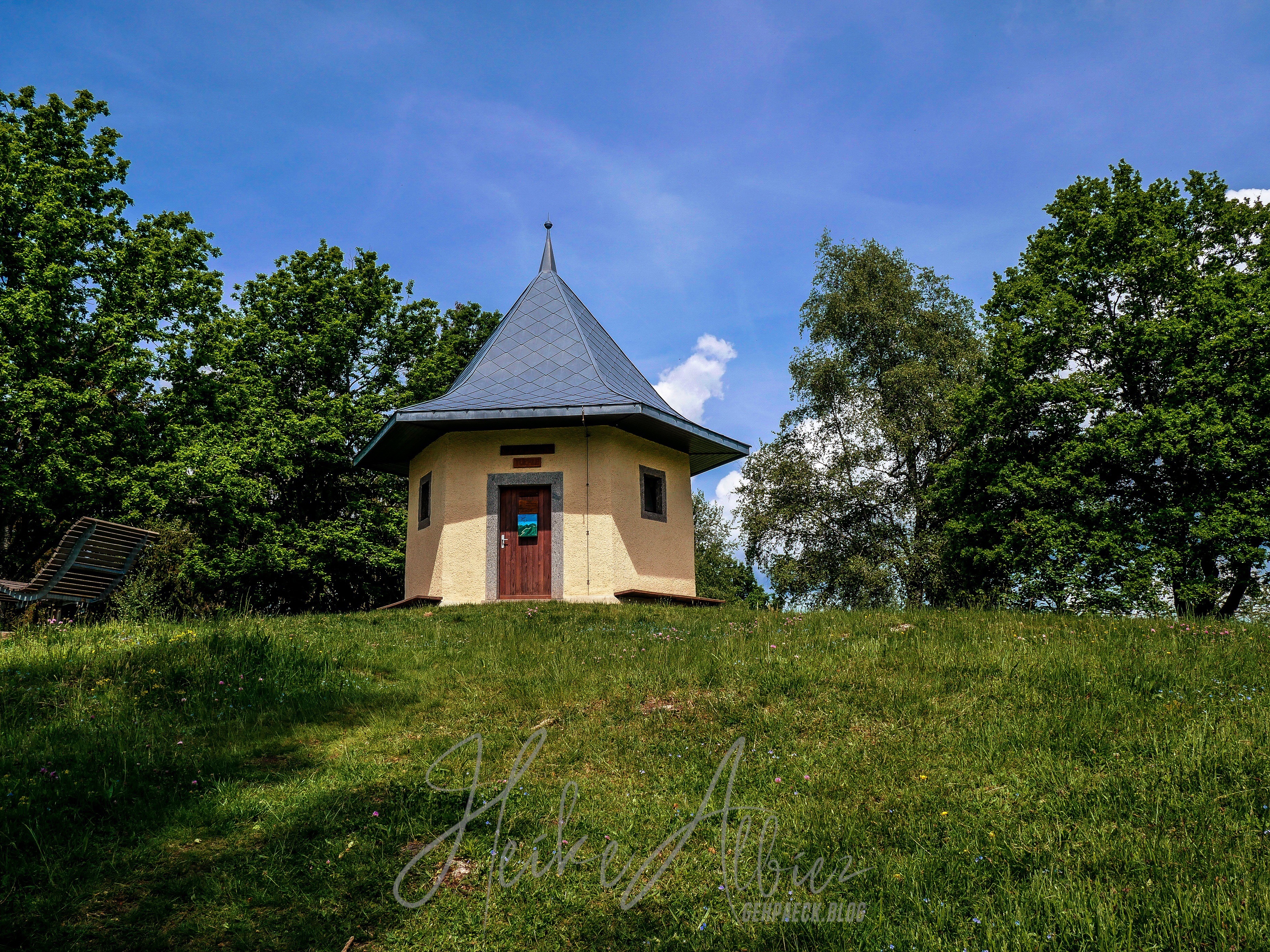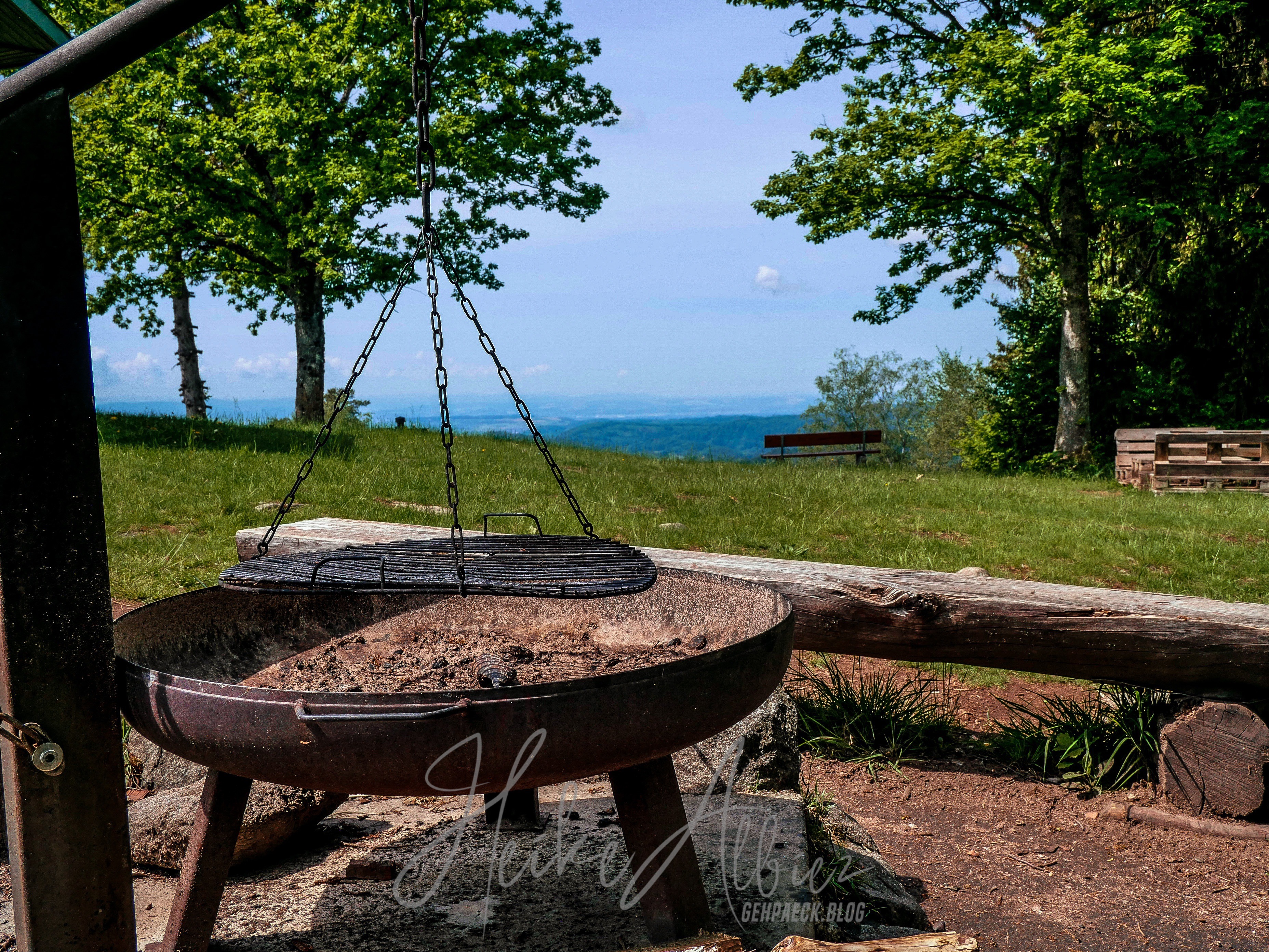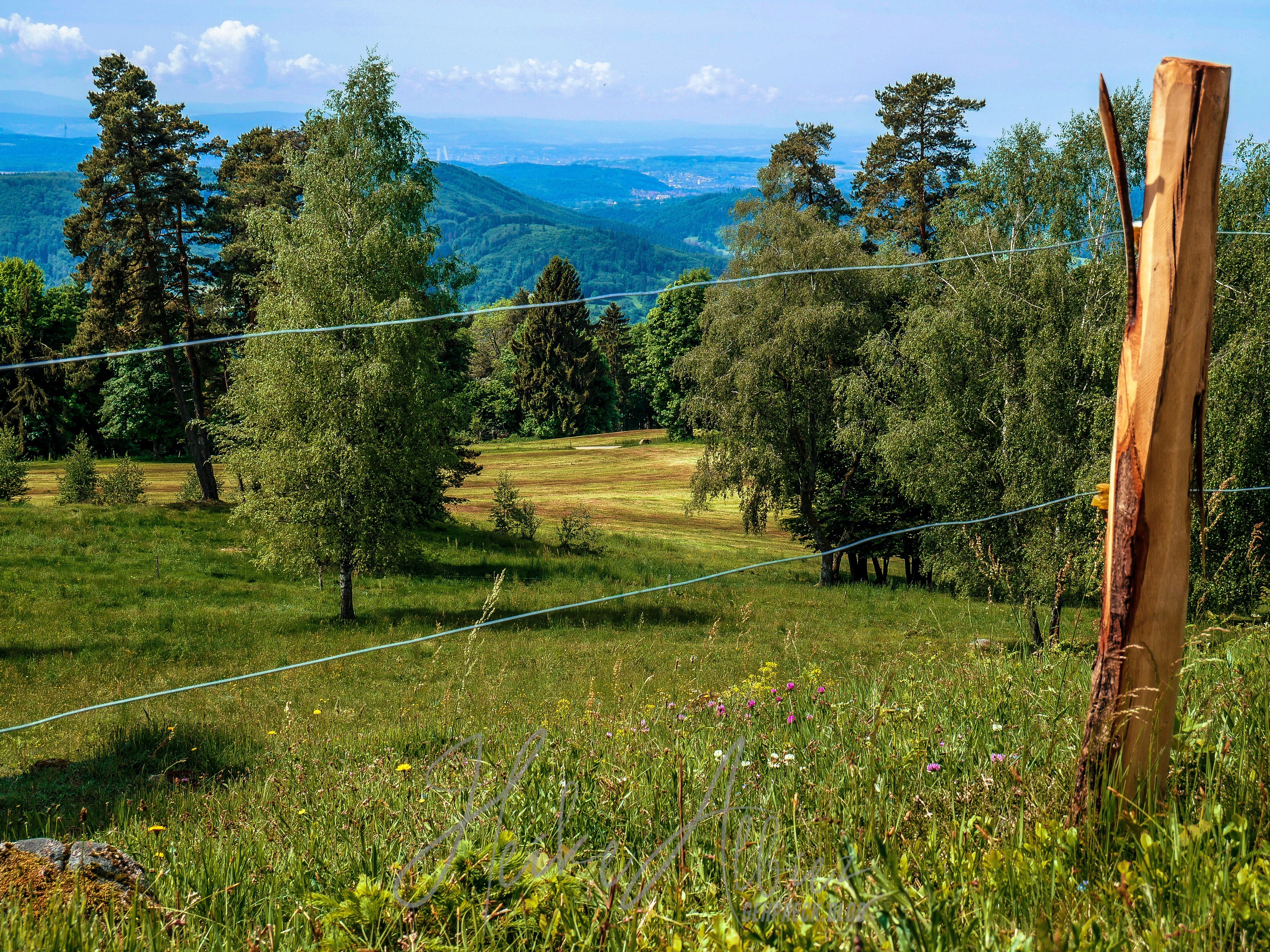 Dieses wunderschöne Fleckchen Erde nennt sich „Rossboden“ , von hier aus wahr es nicht mehr weit zum laufen, der Rümmelesbühl Turm war mit 200 m ausgeschrieben. So hieß es für mich Abschied nehmen von dem so schönen Plätzchen, an dem ich hätte noch ewig so ruhend sitzen und die Seele baumeln lassen können. Noch unwissend, welches kleines Highlight mich noch erwartete, lief ich in die ausgeschilderte Richtung. Wieder war das Gras kniehoch gewachsen, ein Drahtzaun trennte die Viehweide vom Weg, es ging nochmals eine kleine Anhöhe hinauf , auf deren Kuppel ein Türmchen zu erkennen war. Abermals erblickte ich staunend ein sich in Harmonie wiegendes Landschaftsbild. Wo bin ich hier? Also ja, bei uns ist es schön in Deutschland, wir haben alles, Berge, Seen, Wälder, Flüsse und ein Wiesental, welches sich hier oben, von einer seiner schönsten Seite zeigt. Hier wachsen Birken in mitten grüner mit Gräsern überwachsener Wiesen, sie wiegen sich im Winde und ihre Blätter tanzen, so wirkt es jedenfalls auf mich. Hier und dort mal ein Felsbrocken ragt hervor, dann diese Aussicht und oben der liebevoll angelegte Grillplatz, rings um diesen kleinen Turm, mit Sonnenliegen und genügend weiteren Sitzmöglichkeiten die einen unweigerlich zum verweilen einladen. Dank des Gresgener Verschönerungsverein, kann man hier herrlich rasten und genießen. Es gibt sogar ein „Hüttenbuch“ in welches man etwas hinein schreiben kann. Ich verweile und schaue mir alles ringsum in Ruhe an, mach meine Bilder und freu mich, dass mich mein Weg hier her geführt hat. Leider wird es Zeit den Rückweg anzutreten und ich zottele los.