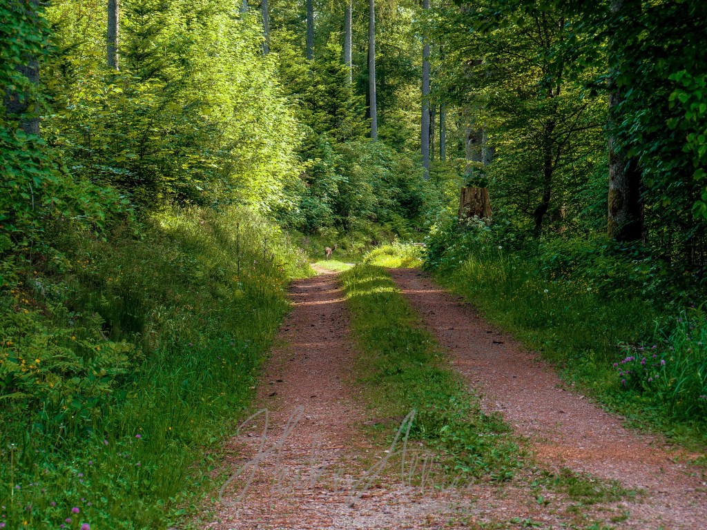 Doch halt! Genau hier hatte ich die für mich an diesem Tag eindrucksvollste Begegnung. Da ich ja immer am ringsherum kucken bin, viel mir auf , dass auf dem zu mir von rechts her führenden Weg , etwas auf mich zu kam, meinte ich zumindest im ersten Augenblick 🙈 ich rieb mir die Augen und nun sah ich es deutlich. Ein Reh, ja genau und zwar lief dieses in einem ganz relaxten Gang, als würde es zu seiner morgendlichen Wald Inspektion unterwegs sein, von mir sich entfernend, den Weg abwärts. Ich löste meine Kamera aus und zoomte was ging, um diesen Moment festzuhalten. Was dabei herauskam, na da kuckt mal…