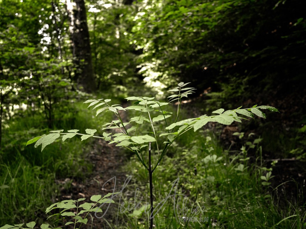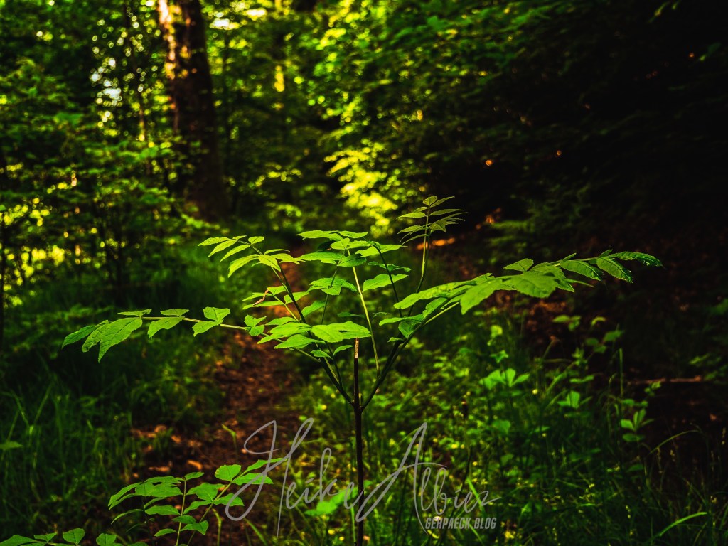 Den breiten leicht ansteigenden Waldweg beschritt ich in einem gemütlichen Tempo, ich hatte ja Zeit und mein Schwerpunkt lag heute auf dem Fotografieren und geniessen, meinen eigenen Rhythmus laufen. Nach einer kurzen Weile bog ich in den Zwerweg ein, er kam mir als der Richtige vor und wirkte auf mich interessant, warum auch immer. Im Nachhinein kann ich sagen, er war einfach nur dichter bewachsen. Ich kam aber wieder auf meiner Route heraus und somit war es für mich ein kurzer Abstecher in ein weiteres Stück heimatliche Natur. Zumal ich mitten auf dem Weg dieses kleine Kerlchen entdeckte…