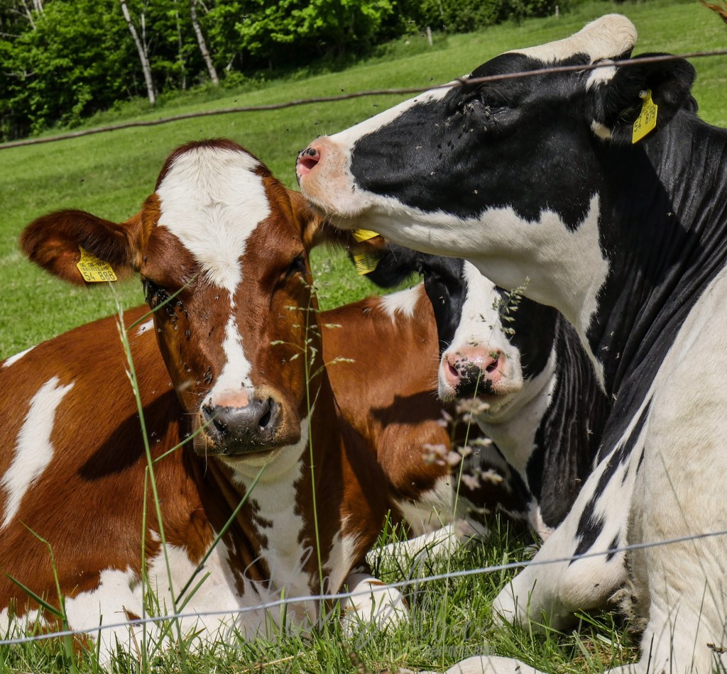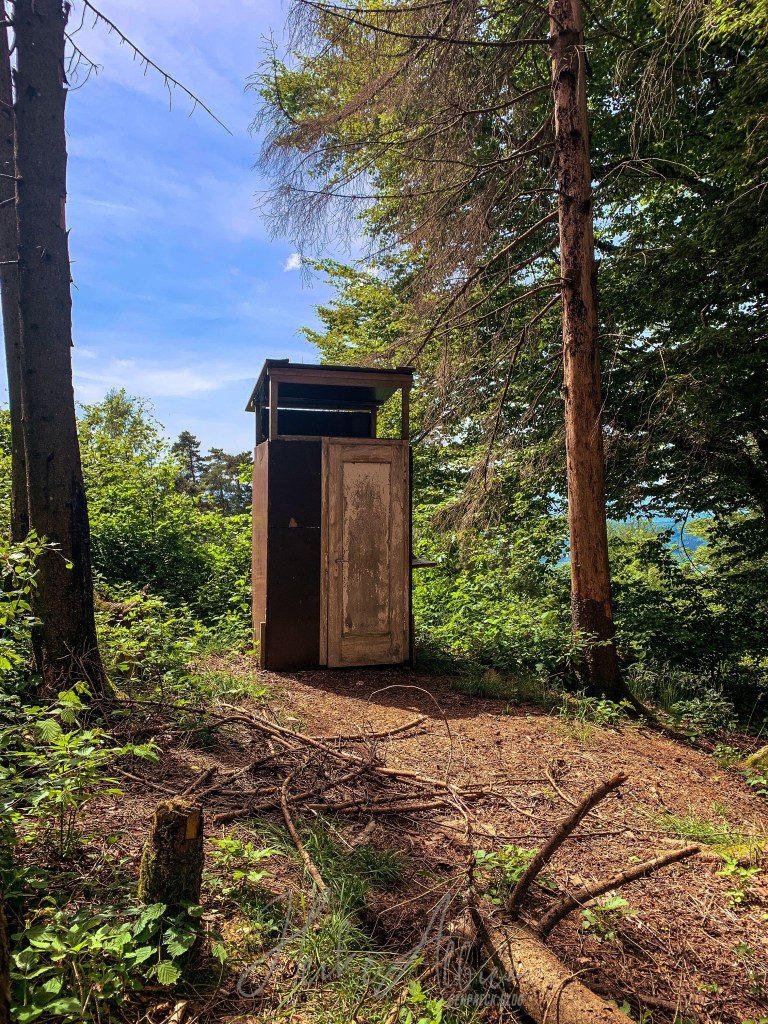 Der Weg verlief für mich eindeutig, dachte ich zumindest. Den Trampelpfad hinein in das kleine angrenzende Waldstück, um es zu durchlaufen, danach an der Kuhweide entlang, dann sollte ich doch auf den Weg , welchen ich von hier oben gerade noch sehe, stoßen und meine Route fortsetzen. Doch ich stand plötzlich vor dem Toilettenhäuschen , soweit ok, kann man sich ja mal anschauen, aber wo bitte führt der Weg weiter? Ich laufe und laufe und laufe in diesem kleinen Waldstück herum , aber überall stoße ich auf diesen Elektrozaun der Kuhweide, also wieder hoch zurück auf Rümmelesbühl und einen Überblick einholen. Anlauf Nummer zwei endet genauso, nirgendwo ein durchkommen, außer ich würde durch den Zaun, nein das geht nicht, oder ? Wie auch immer, nach dem dritten Anlauf befinde ich mich hinter dem Elektrozaun querfeldein die Kuhweide hinunter und holpere und stolpere irgendwie auf die rechte Route, die mit der gelben Raute.